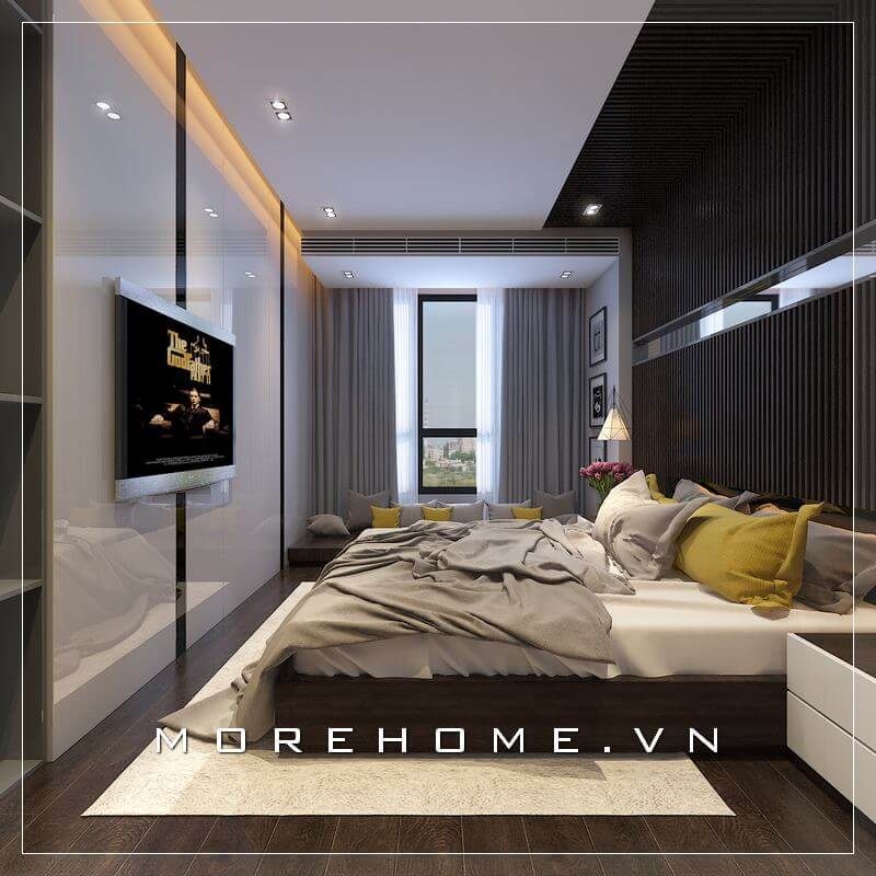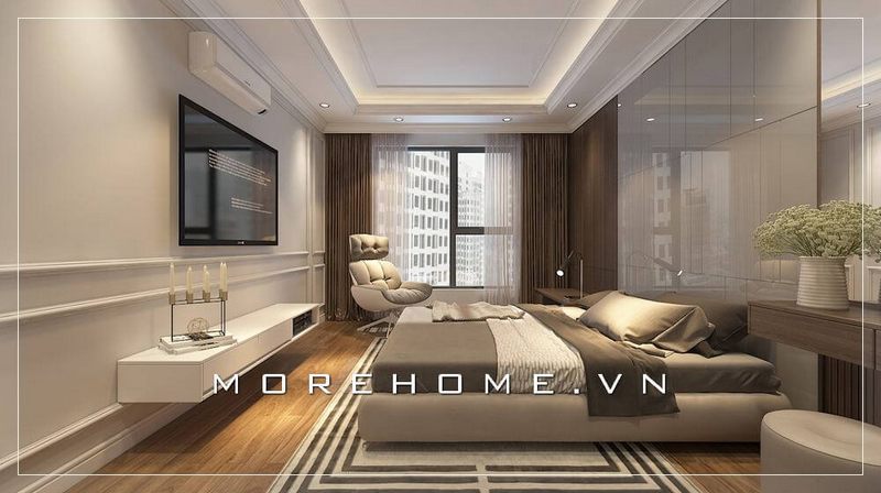 Nội thất phòng ngủ chung cư hiện đại, giường ngủ bọc da dạng thấp, kệ ti vi treo tường... mang lại không gian nghỉ ngơi thư thái và rộng thoáng hơn