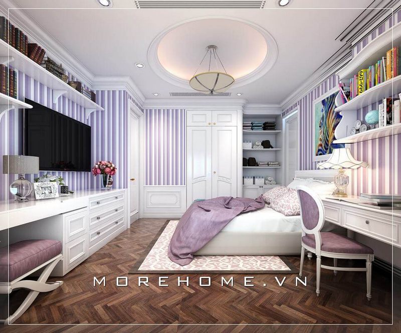 Mẫu thiết kế phòng ngủ nữ tính ấn tượng, giấy dán tường họa tiết kẻ sọc được gia chủ lựa chọn tạo hiệu ứng rộng thoáng hơn cho không gian phòng ngủ
